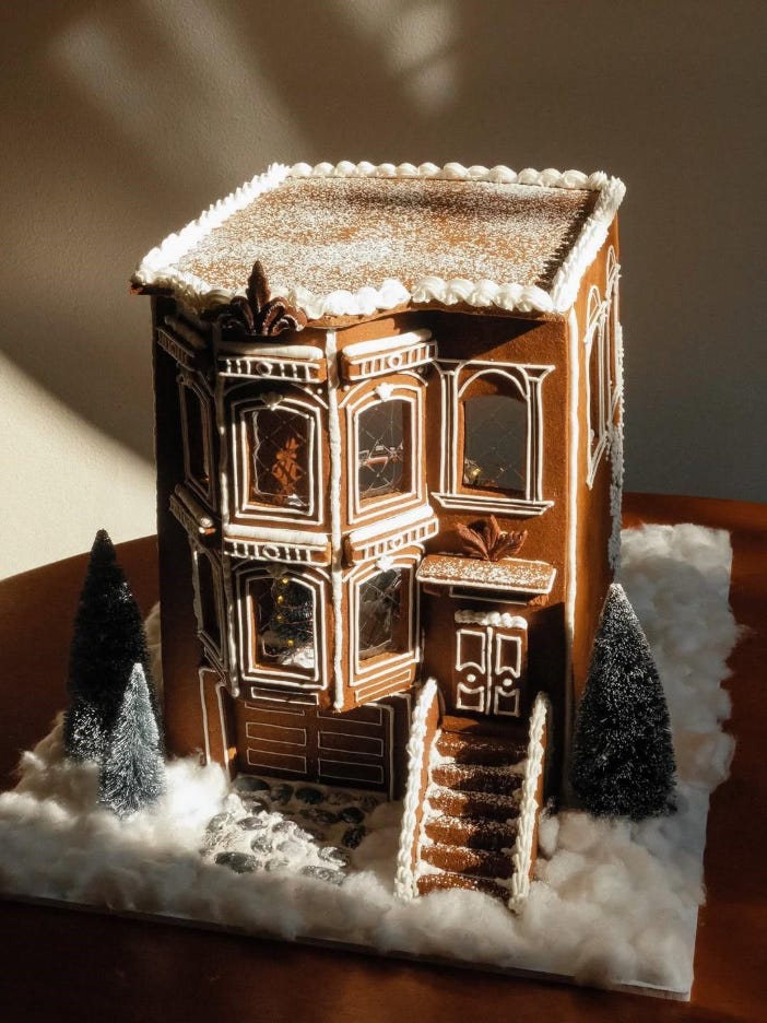 San Francisco-based creator and cook @lizfoodfeed’s gingerbread houses have become the stuff of legend and 200k followers are here for it. From a gingerbread greenhouse to a gingerbread cafe with a chocolate stepping stone pathway, Liz’s designs are high design meets holiday. She most recently crafted a San Francisco Victorian, built with 42 gingerbread panels, nine pounds of dough and enough icing to outline every bay window, corbel and staircase flourish. There’s a chocolate-rock driveway, dry-ice fog for dramatic effect and a twinkling tree glowing through the sugar-glass windows. This is gingerbread for the floor-plan-obsessed, polished enough to pass for an Architectural Digest spread.