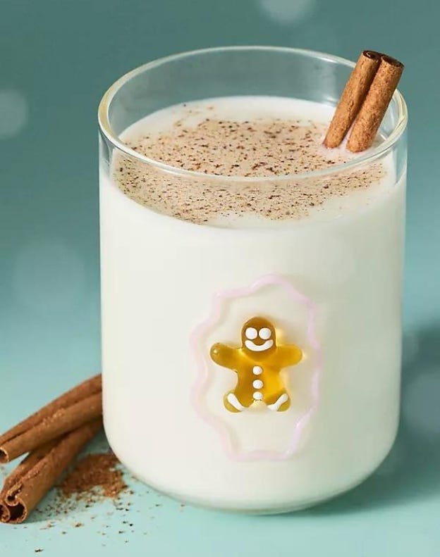 Playful gingerbread graphics wrap these festive juice glasses, adding instant holiday cheer to your breakfast table or cocktail setup.