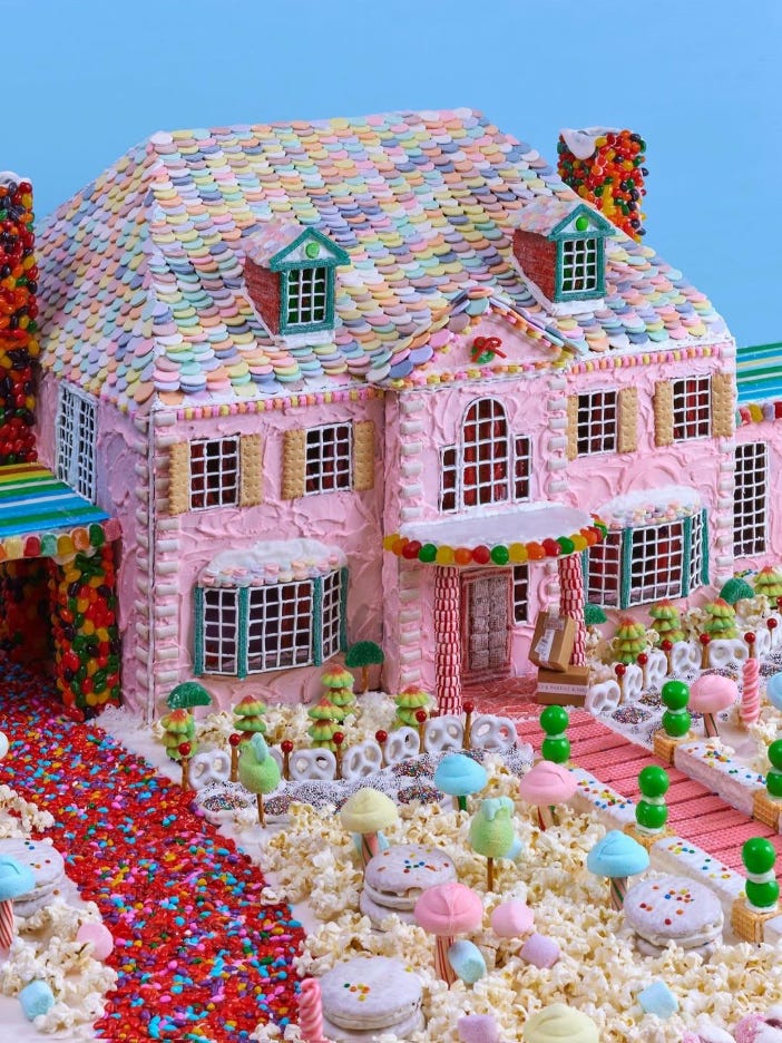 Houses & Parties, an events, interior design and retail collective, delivers gingerbread maximalism, full stop. Founder Rebecca Gardner’s candy-crafted Georgian mansions look like Wes Anderson directed a holiday bake-off, complete with Nerds-paved driveways, peppermint columns, gumball topiaries and Snowcap garden paths. It’s high-camp confectionery architecture.