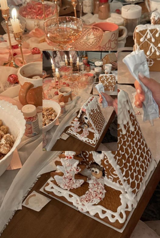Gather your friends for a gingerbread girls’ night and make holiday architecture the activity. Danielle Glanz Shane of @shestyledwhat’s hyper-feminine holiday setup is the blueprint. Think pink pajamas, taper candles, gingerbread-house mugs and a decorating table that looks curated by the Sugar Plum Fairy herself.
