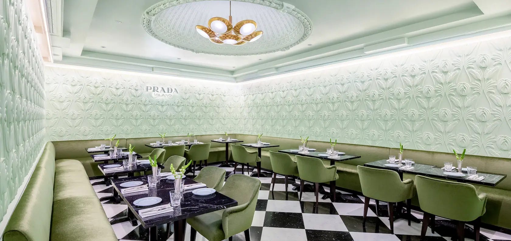 Opened in 2023 and set to run through February 2026, the Prada Caffè in London is set inside luxe department store Harrod’s in London. Inspired by Prada’s most famous stores – including its first-ever boutique, opened at Galleria Vittorio Emanuele II in 1913 – Prada Caffè features the brand’s iconic green on the walls, ceilings, and velvet-upholstered banquettes while the floors reproduce the black-and-white checkered floor of the Galleria Vittorio Emanuele II. With rumors that Prada is planning to open its first U.S. café in New York City's Soho neighborhood, we're waiting with coffee cups in hand to see what's brewing.