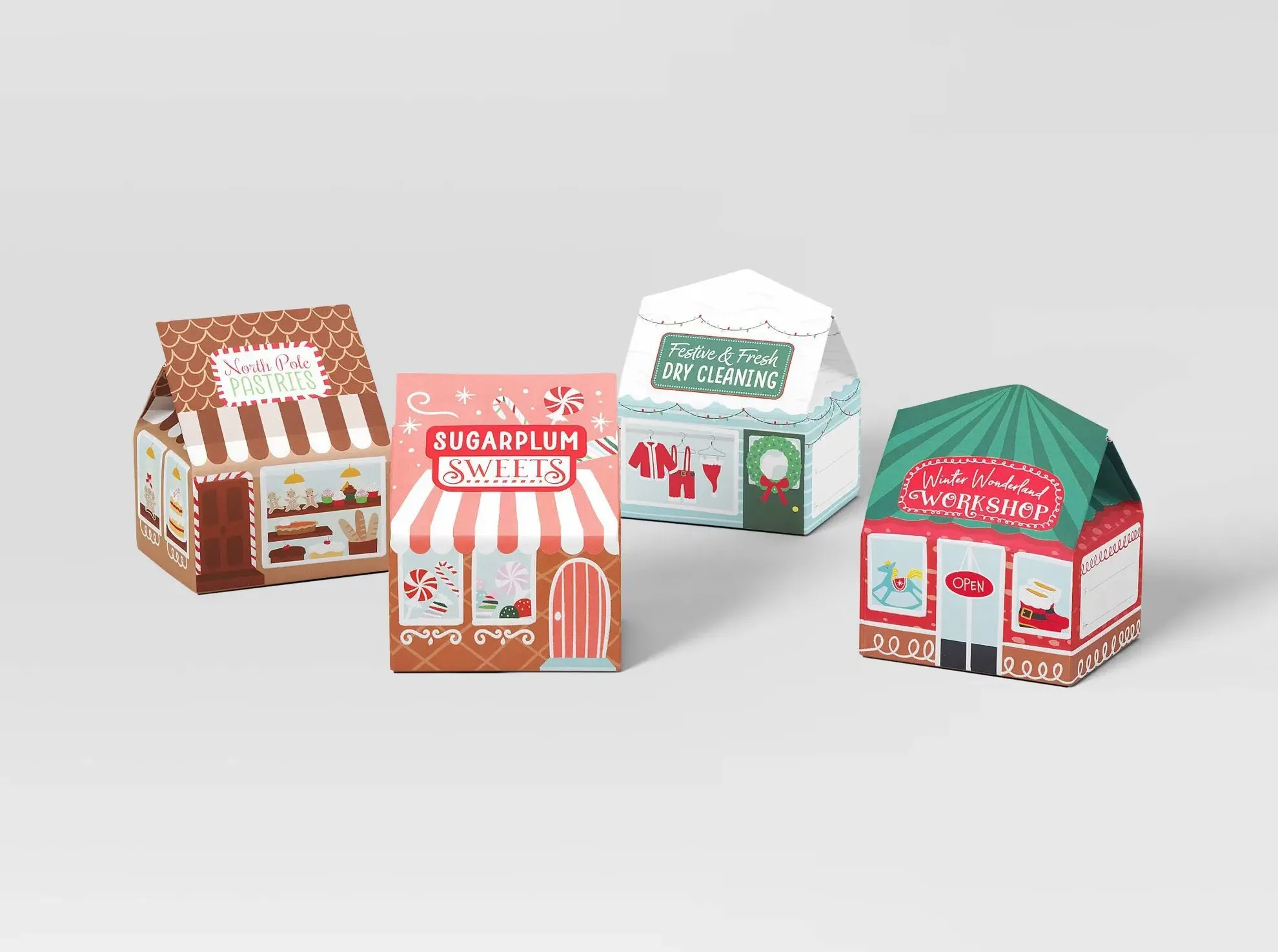 Make your holiday presents merry and bright with this 4-Count Christmas Inline Flatbox Set from Wondershop™. This set includes four Christmas boxes featuring Christmas-themed shop fronts — North Pole Pastries, Sugarplum Sweets, Festive & Fresh Dry Cleaning, and Winter Wonderland Workshop — for a whimsical touch. Made of paper, these Christmas boxes come with “To:” and “From:” labels for easy identification.