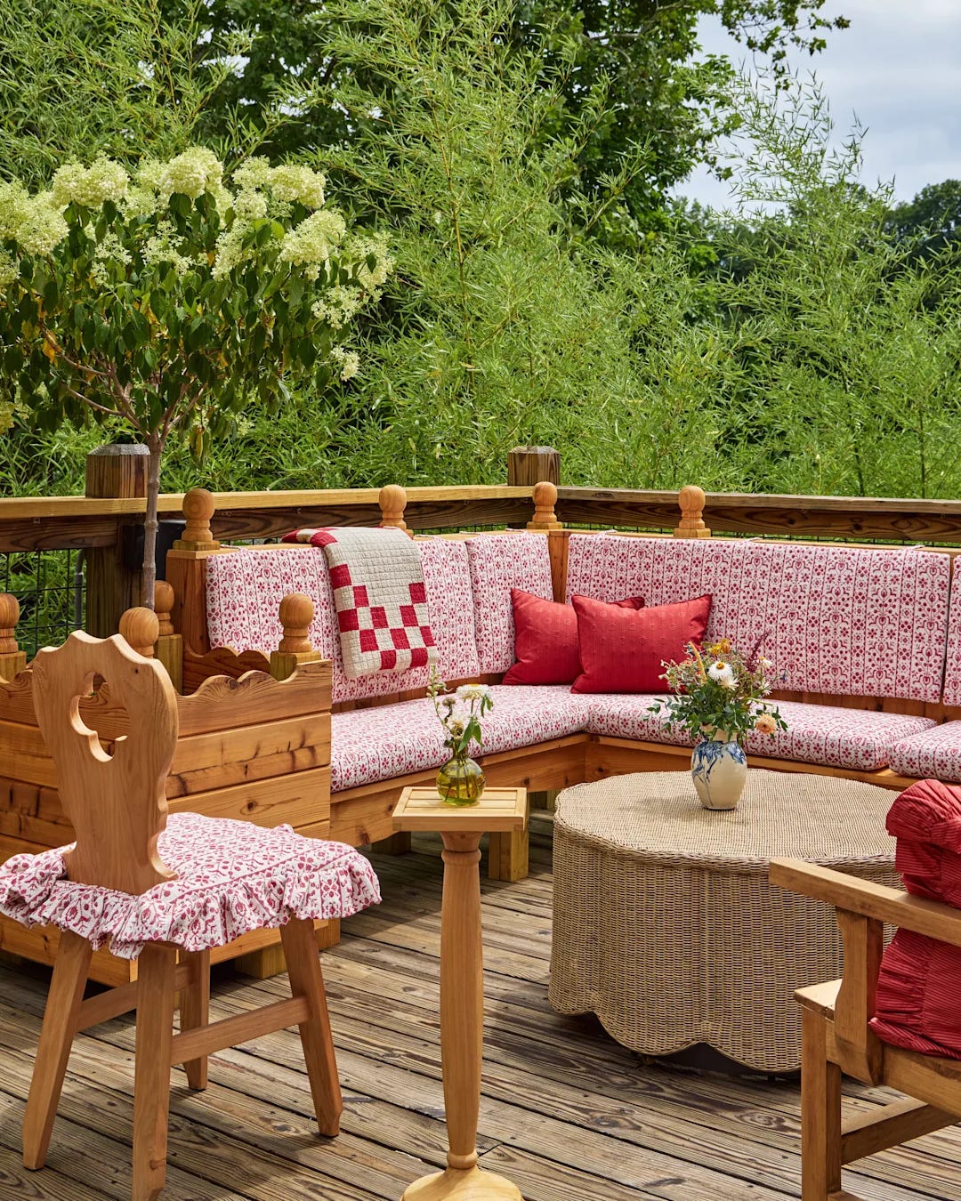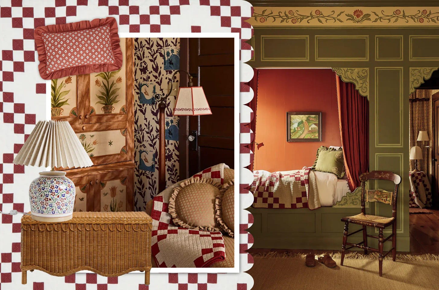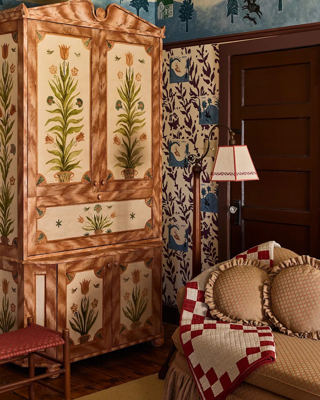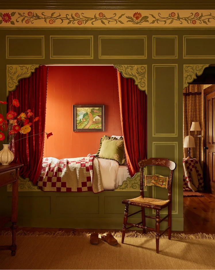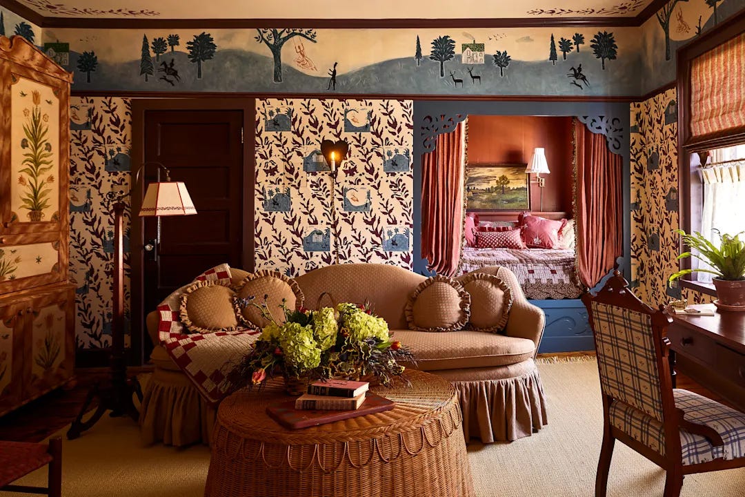 The Innkeeper’s Suite, inspired by imaginary family travels to the Austrian Alps, channels the Tyrolean vernacular with handmade wallpaper, a hand-painted box bed and persimmon window shades that feel charmingly maximal without going off the rails.