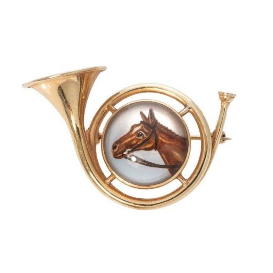 A circa-1910 statement piece featuring a hand-painted reverse intaglio horse set in a 14K gold hunting horn.