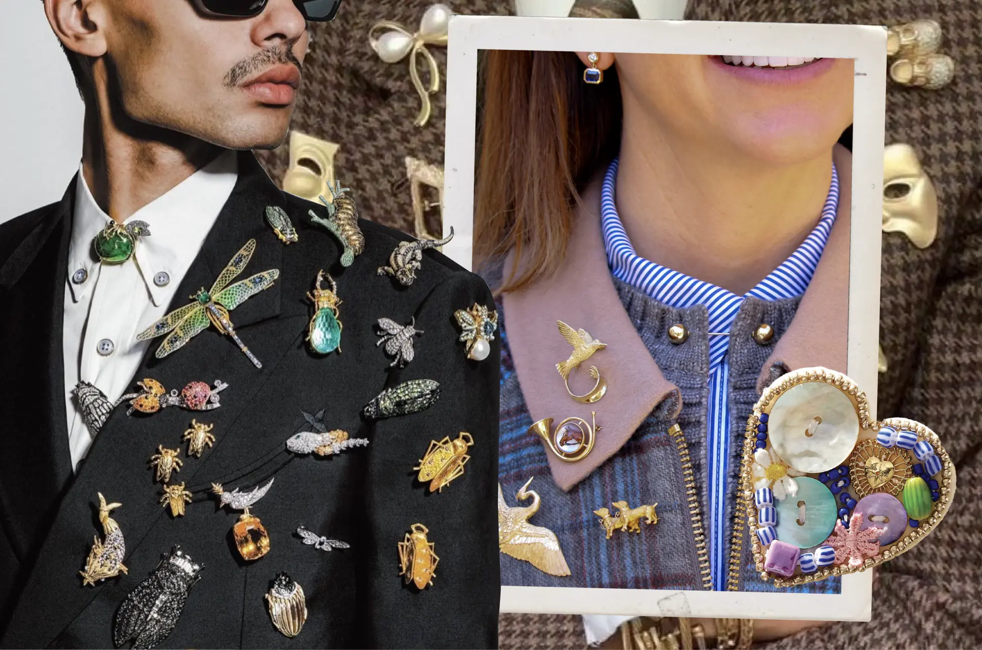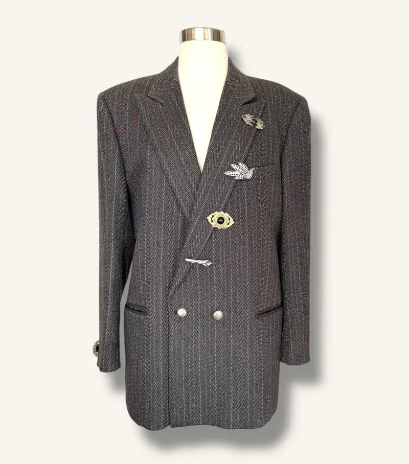 Vintage brooches add an unexpected twist to this classic herringbone blazer.