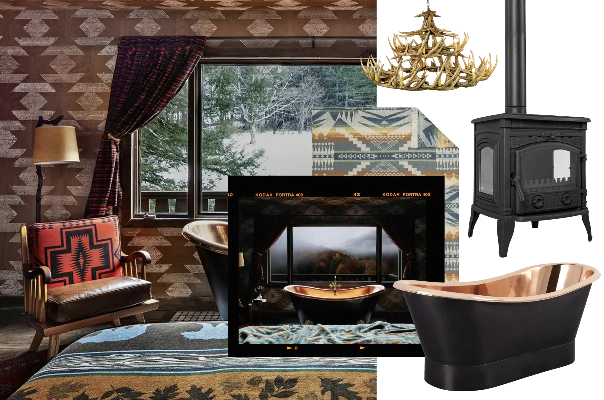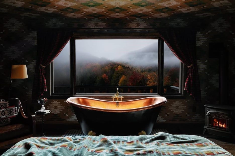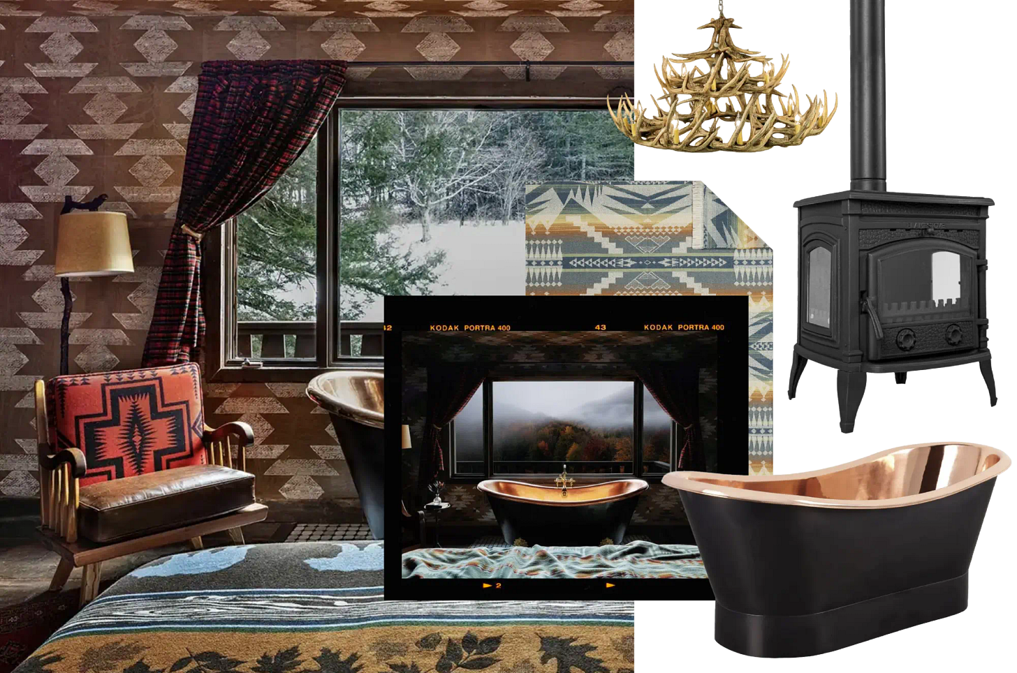 Copper and clawfoot silhouettes glow like art pieces, framed by floor-to-ceiling windows, turning every soak into a panoramic moment. Think Catskills maximalism with a Western wink: hand-printed wallpaper, Pendleton blankets, heated floors and cast-iron stoves. The look taps into the current nostalgic wave for rugged-meets-romantic interiors; wilderness meets slow-living luxury.