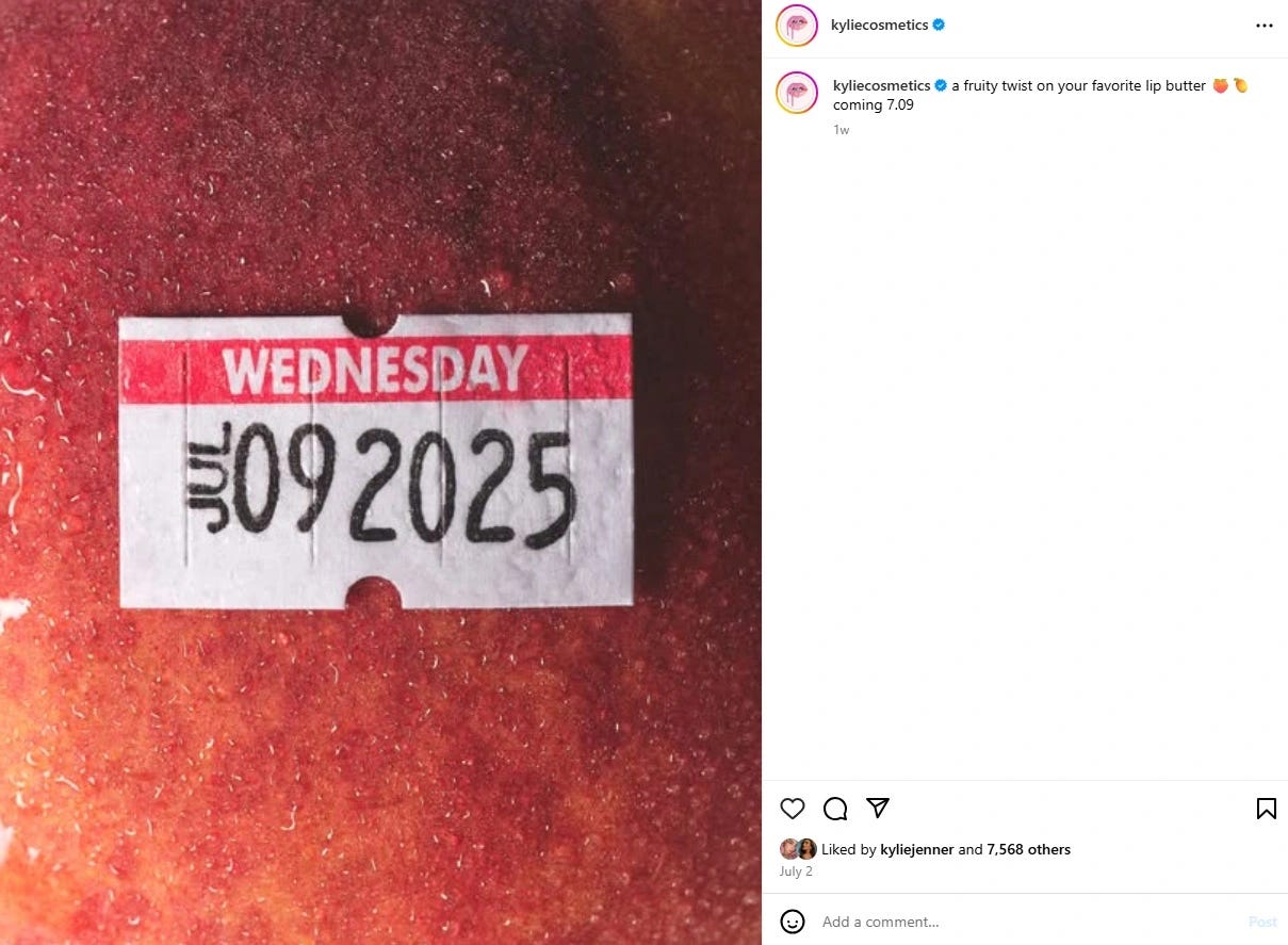 Kylie Cosmetics dropped a July 9 expiration-date sticker⊠on a fuzzy peach to tease their peach mango lip butter.