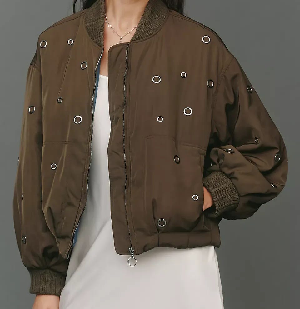Olive green with an edge. Grommets add a sparkly yet utilitarian touch to this bomber.
