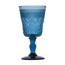 Made of pressed glass with heirloom shapes anchored by hefty pedestal stems, these water goblets are ready to add a nice punch of bleu for water or wine.