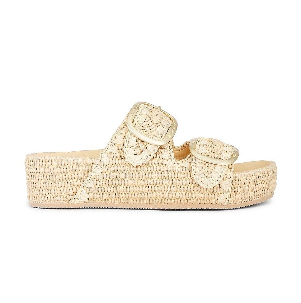 These raffia-wrapped platforms bring effortless height and summer texture, with contoured leather footbeds and buckled straps made for long walks and laid-back luxe.