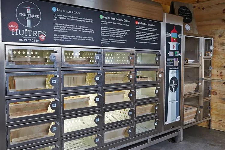 Across the Atlantic, vending machines are a roadside staple dropping tasty little treats throughout Europe. Seafood stans in Ars-en-RƩ, France can get their fix at an oyster vending machine that sells up to five dozen at a time, alongside patƩ and sea asparagus for a DIY midnight feast.