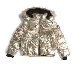 Cute puffer with a metallic finish and faux fur lined hood.