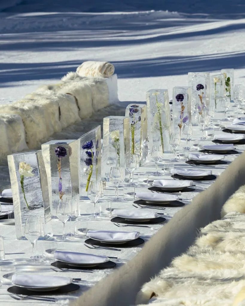 Moncler said “dinner… but make it the Alps.” Moncler and Luxottica celebrated their latest eyewear collaboration with an elegant dinner in the snowy ski resort of Crans Montana, Switzerland. A massive open-air table carved straight into the snow, lined with sheepskin seats and crystal-clear ice blocks holding frozen florals, turned a Swiss mountainscape into the chicest dining room on Earth. It’s experiential dining in its peak form.