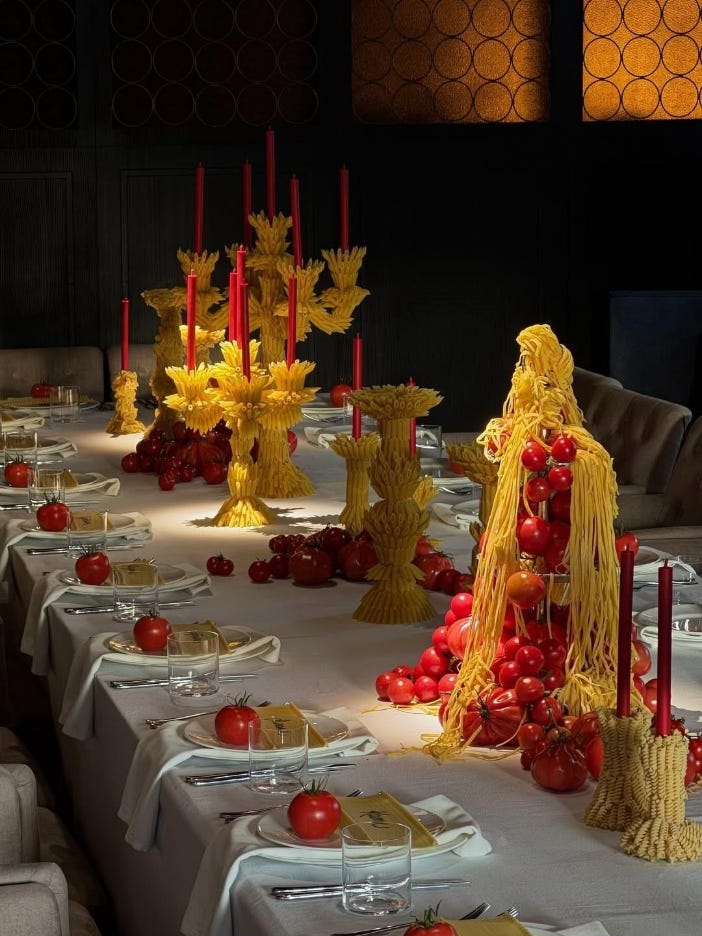 Forget florals, this dinner went full carb couture. For a birthday bash at Vino e Cucina, the table became an ode to pasta in all its forms—towering candelabras built from rotini, farfalle fanned like bouquets and glossy tomatoes cascading over tiered stands. Pasta doesn’t just belong on the plate, it belongs in the spotlight. A feast for the eyes before the fork even hits the table.