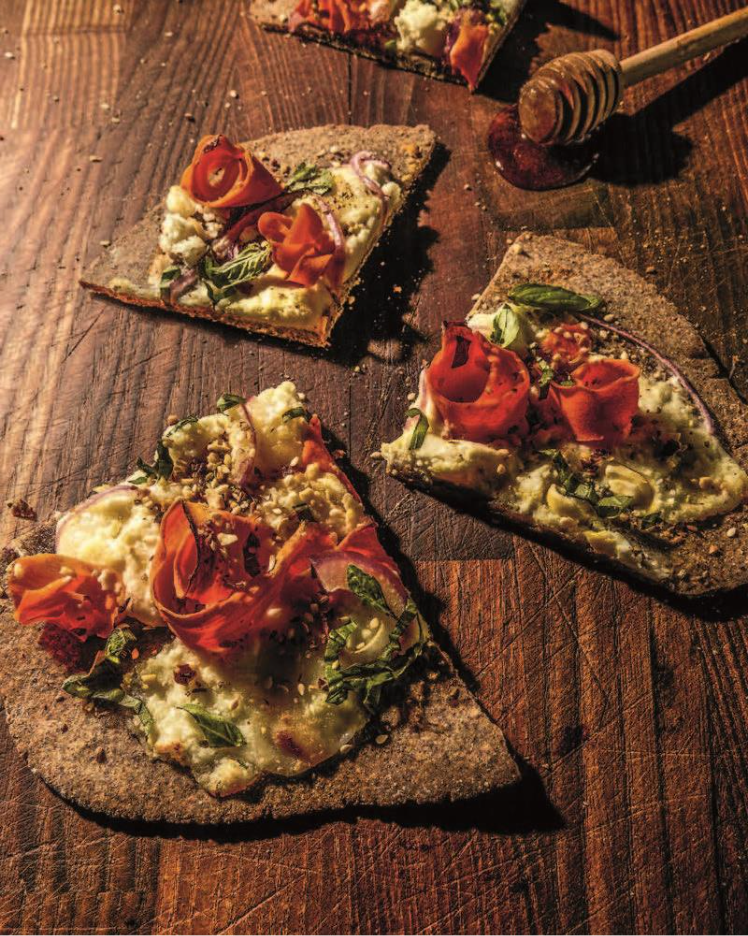 “One of our favorite ways to celebrate, just the two of us, is having a pizza night with a 72-hour pizza dough. Watching my husband feed our starter and tend to a levain throughout the week warms my heart, and the romance gets a chance to build up all week long. I make a long-simmered pizza sauce, he tends to the dough and the day of, we each build and shape the pizzas, and then we fire them off in the Ooni or the oven preheated with a pizza stone.”