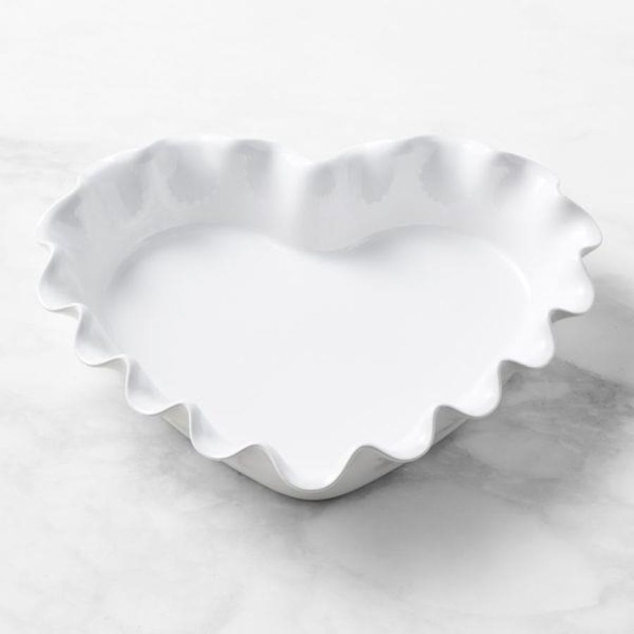 This handcrafted French ceramic pie dish delivers even heat and flawless browning, then goes straight from oven to table with a ruffled, heart-shaped design.