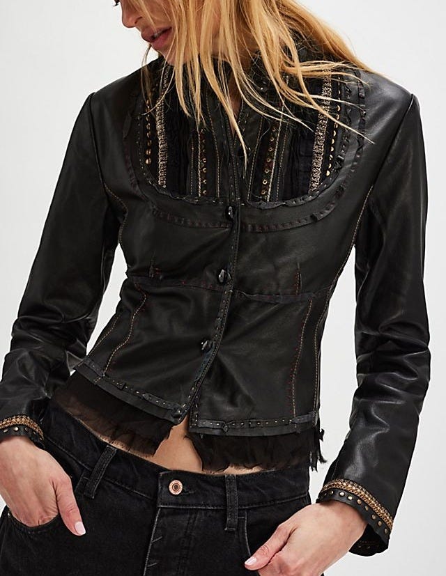 Undeniable cool is all yours with this leather jacket from Nigel Preston, featured in a corset-inspired style with embroidered details and a raw-cut ruffled hem.